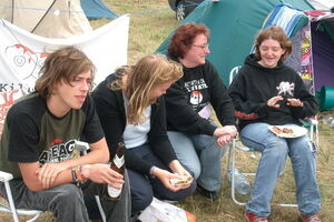 Es war viel Bier. Denn am nächsten Morgen ging das Frühstück erst gegen 16 Uhr runter. Meine 8 Kumpels (alles "Forenlose"), sind derweil ins Freibad gefahren. Der Rest saß unter den Pavillions in der Mitte des Camps. Es war ziemlich warm und zur Erfrischung besprühten wir uns mit einem Wasserzerstäuber. :D Hört sich ziemlich doof an... .:D
