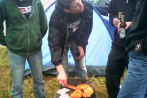 Nachdem wir uns was zum Frühstück gegrillt haben, fuhren wir am nächsten Morgen noch mal einkaufen (wir = Kirsten, der Axelerator, das eine unserer Kinder, Säb und ichse). Kirsten kannte da ne ganz tolle Abkürzung zum Aldi, bei der ihr Auto (Merkt euch, ich steh irgendwo auf Parkplatz 4) auch nur ganz selten auf dem Boden aufsetzte. Wir kauften erstmal für drei Tage Grillwürste, Baguettes und Bier ein (sonst aber auch nix weiter) und ab zum Basislager. Grill anschmeißen! Am Abend rockten uns Kettcar, Wir sind Helden, Rammstein. Oasis spielten auch. Leider ging meine Brille dabei verschipp! Dass ich dadurch auf der Rückfahrt trinken konnte, war ein eher schwacher Trost. Jetzt bin ich erst mal für ein paar Tage ohne Klarblick, da meine letzte Brille das Taubertal 04 nicht überlebt hat... Aus Schaden wird man...egal!